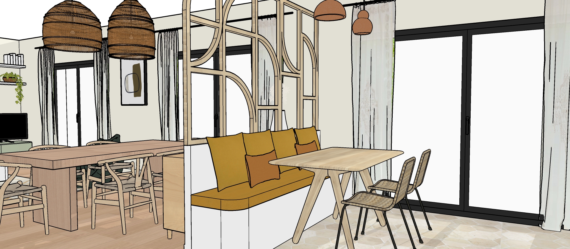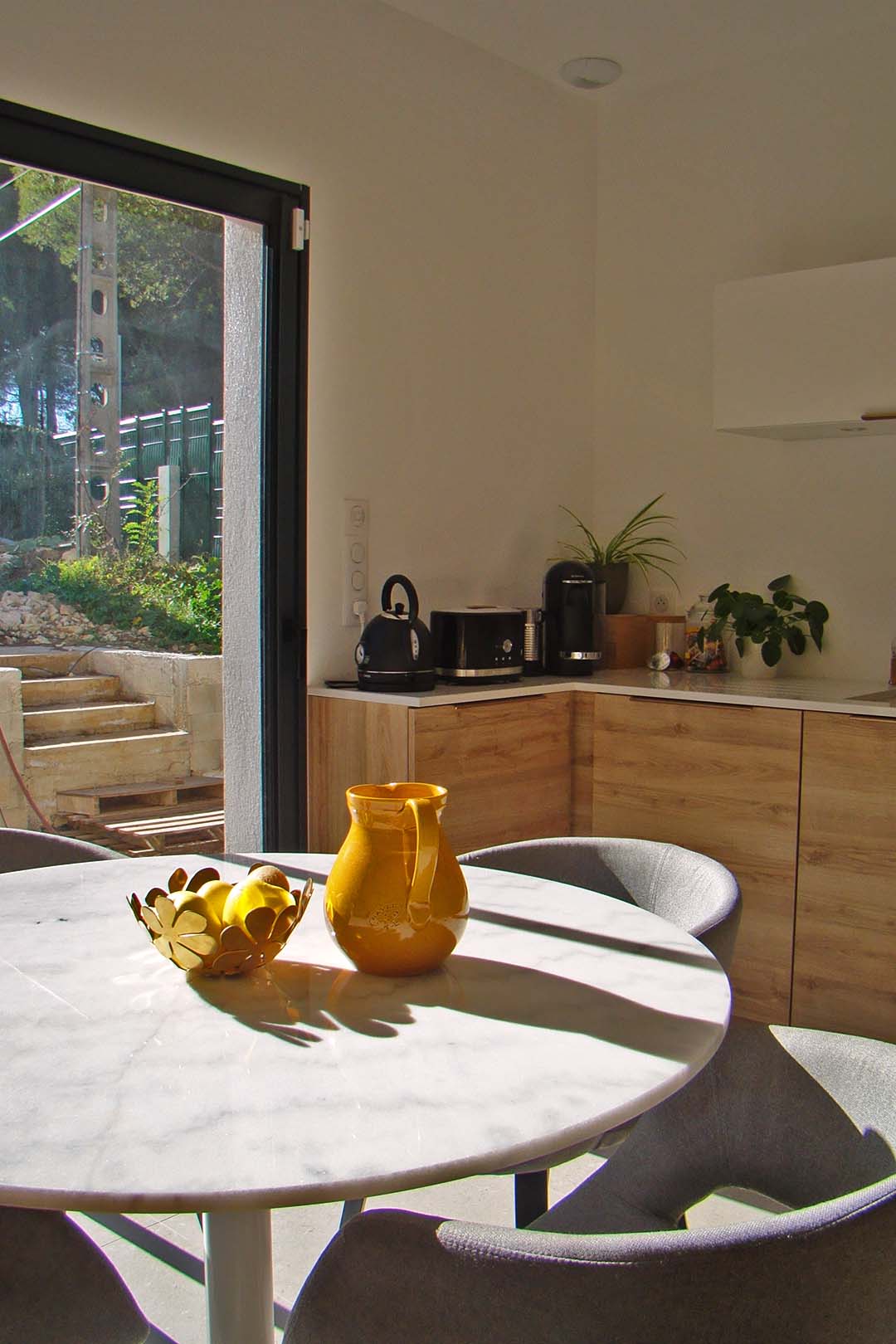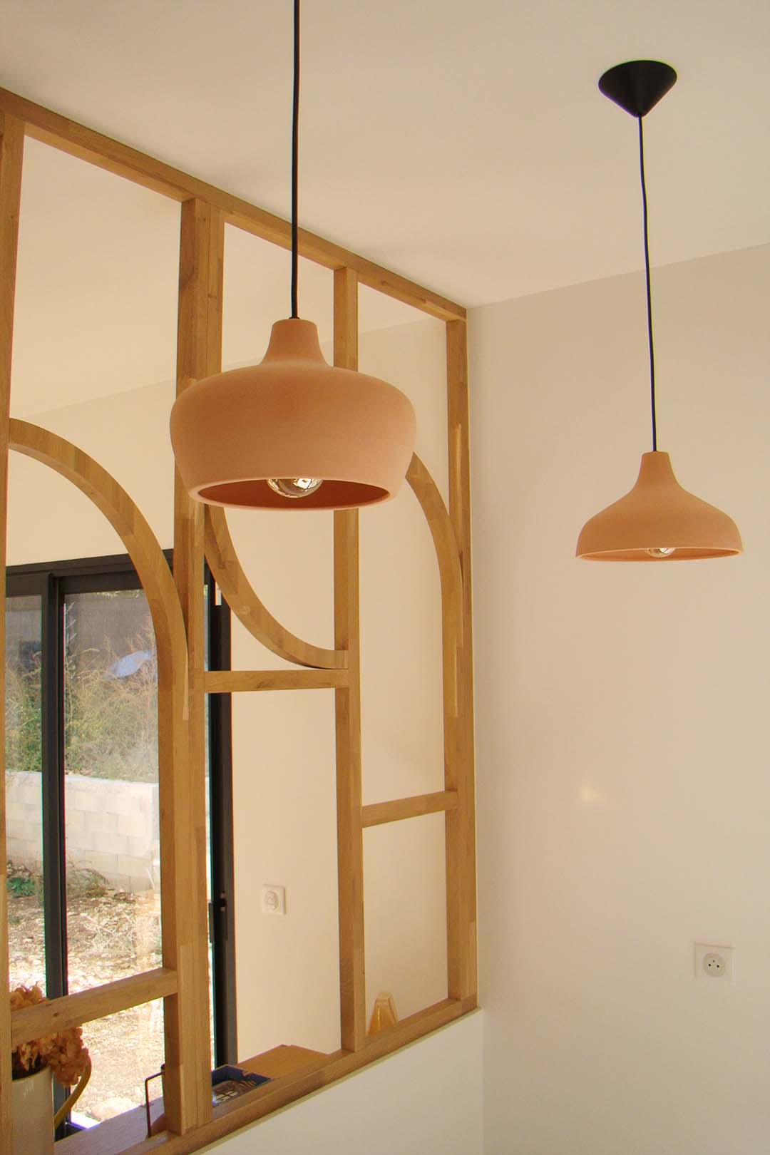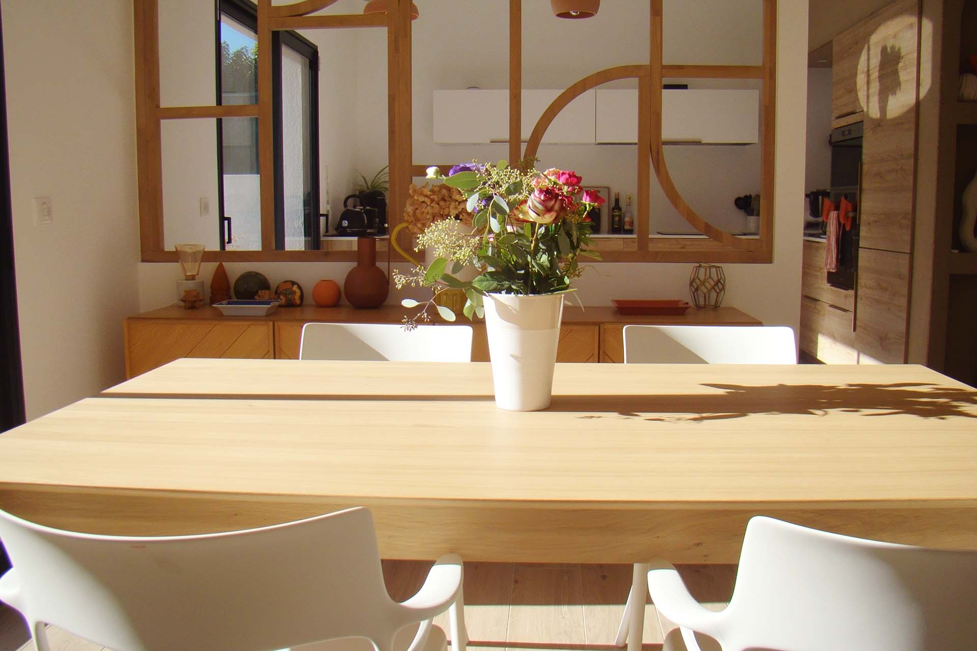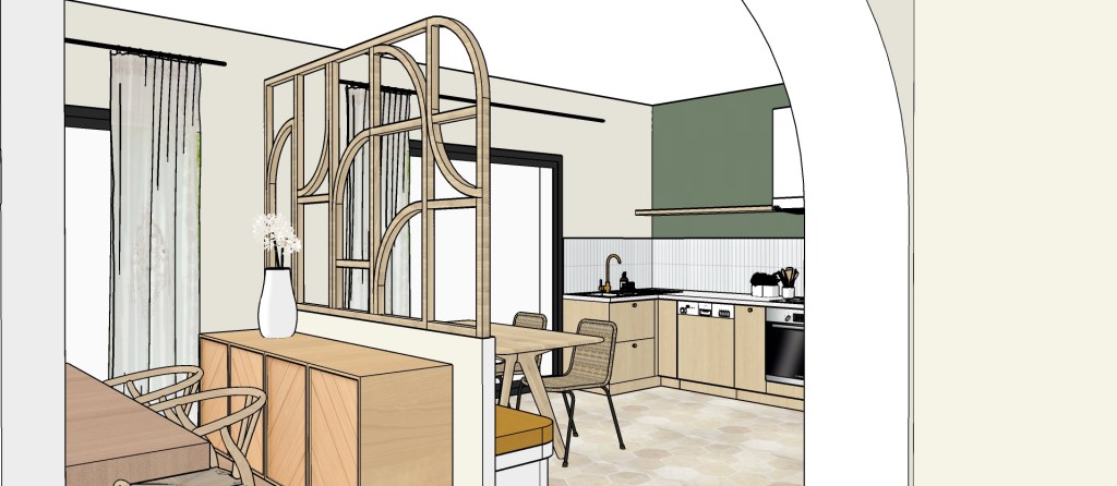 En pièce maîtresse, un grand claustra en bois réalisé sur-mesure vient séparer la cuisine du séjour offrant côté cuisine, une banquette pour l’espace repas qui sera installée par la suite. Des matériaux aux teintes naturels viennent apporter la touche méditerranéenne tant voulue par les propriétaires. De la couleur par touches ponctue chaque espace pour leur apporter de la profondeur et du caractère.