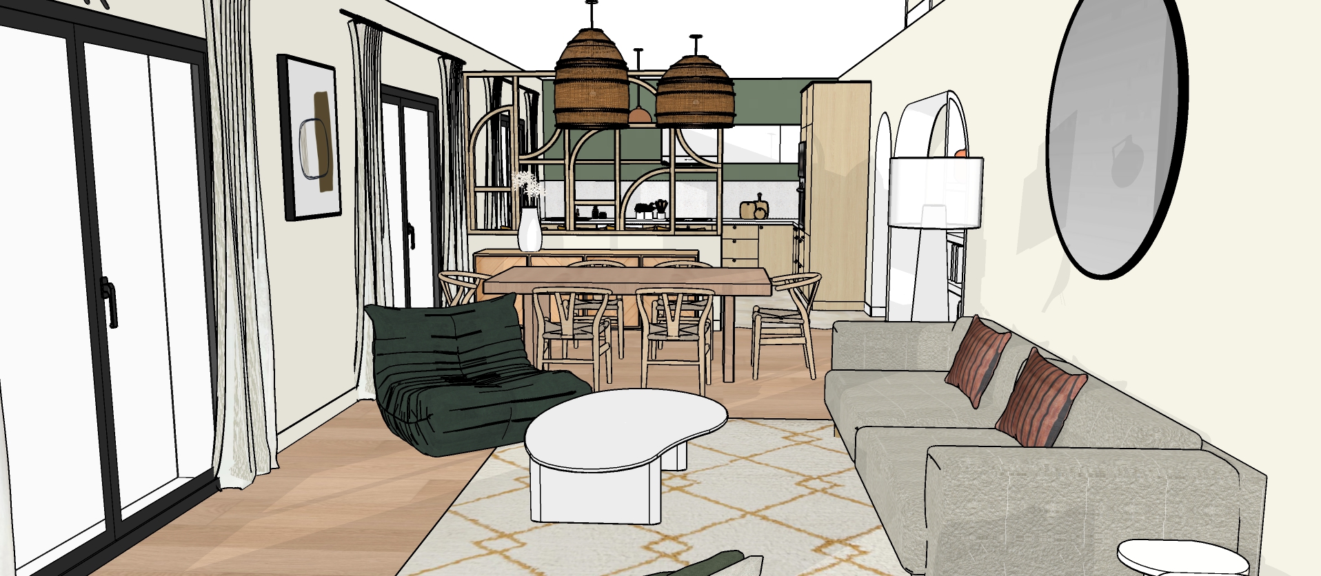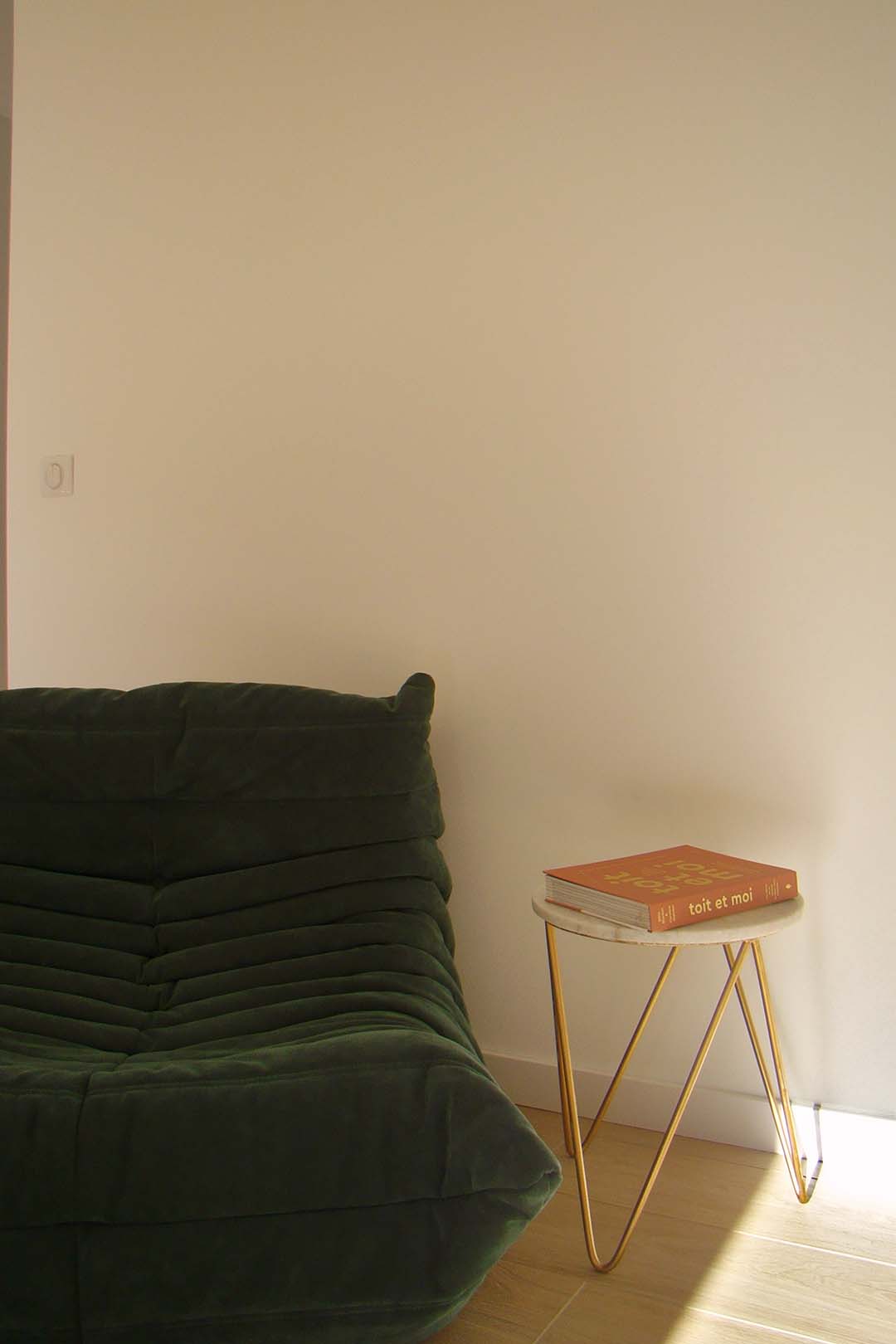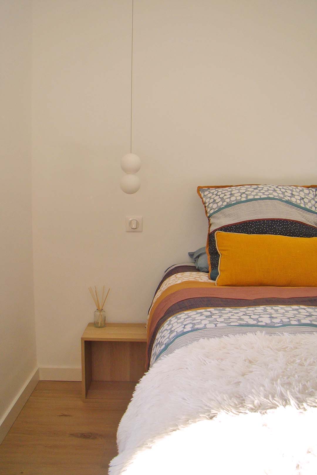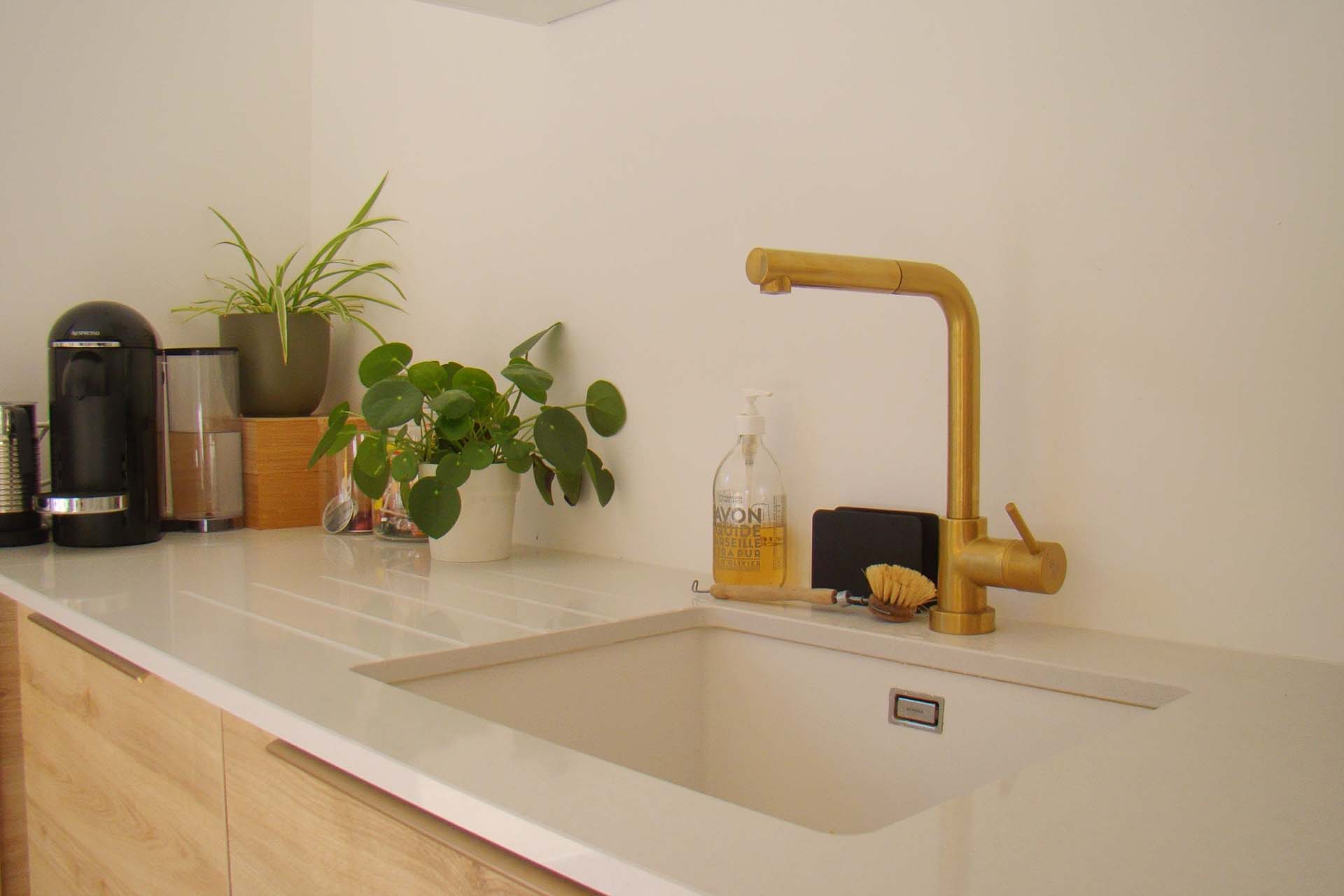 En pièce maîtresse, un grand claustra en bois réalisé sur-mesure vient séparer la cuisine du séjour offrant côté cuisine, une banquette pour l’espace repas qui sera installée par la suite. Des matériaux aux teintes naturels viennent apporter la touche méditerranéenne tant voulue par les propriétaires. De la couleur par touches ponctue chaque espace pour leur apporter de la profondeur et du caractère.