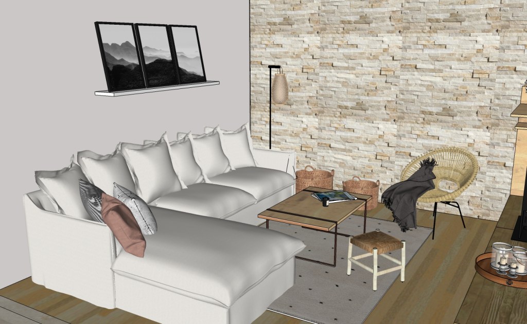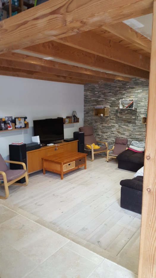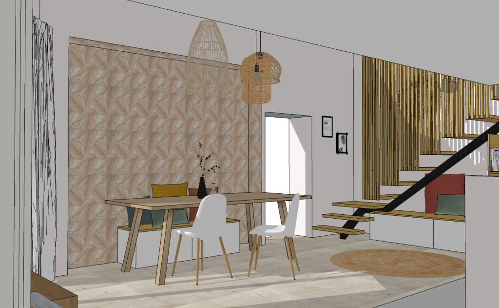 Pour ce projet, mes clients désiraient un espace de vie plus adapté à leur vie quotidienne. Parents de deux enfants, mes clients avaient besoin de restructurer l’espace salle à manger implantée au centre du séjour où leurs filles jouent et font leurs devoirs. Les circulations ont donc été revues afin d’offrir un maximum d’espace et la salle à manger a été reconfigurée pour plus de confort et de convivialité. Un espace lecture a été créé sous l’escalier et l’agencement du salon a été modifié afin qu’il soit plus accueillant. La décoration a été choisie dans un esprit bohème comme le souhaitaient mes clients avec des touches de couleurs chaudes se mariant avec les matériaux existants.