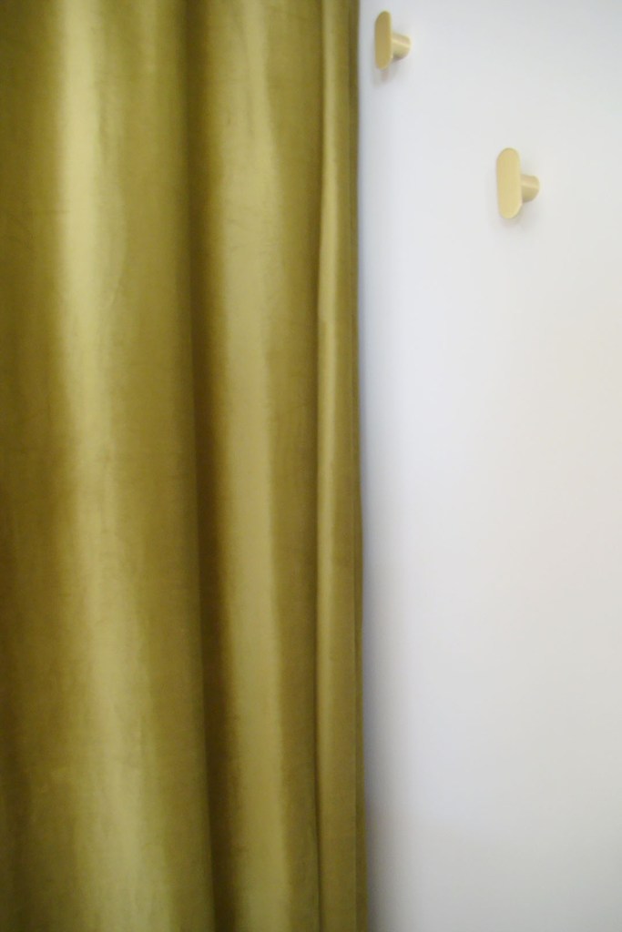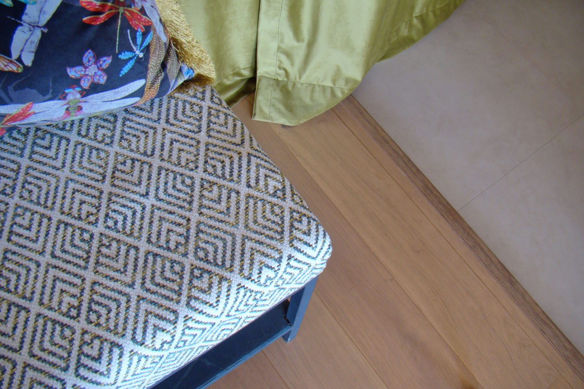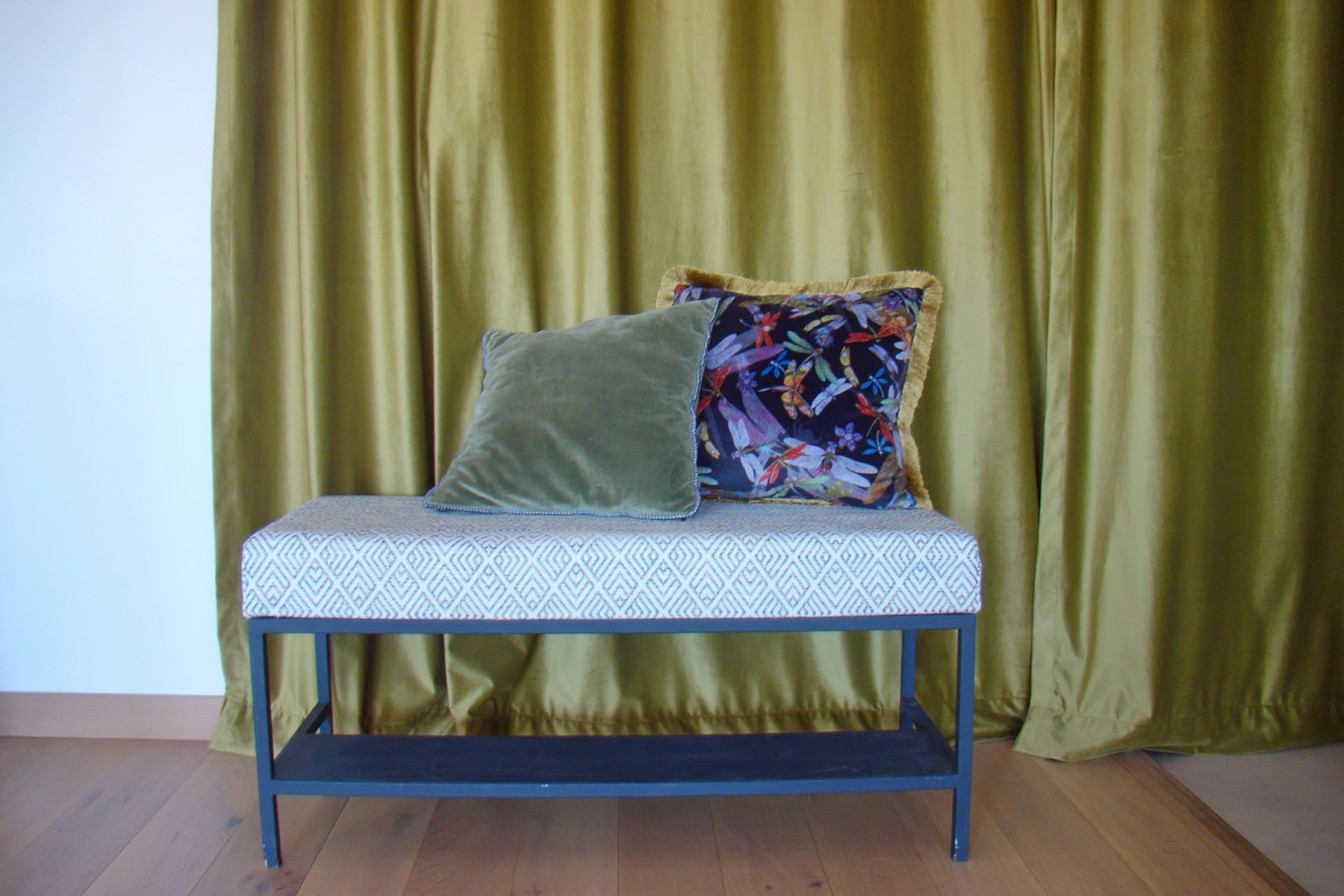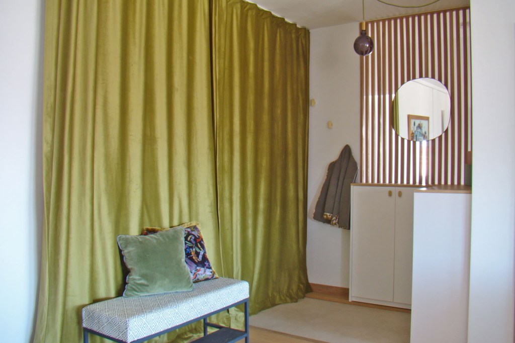 Enfin, des rideaux sur-mesure en velours ont été confectionnés afin de calfeutrer la porte de l’ascenseur ainsi que la porte de secours donnant sur le palier. Pour apporter de la fonctionnalité à cette entrée et compléter l’harmonie du décor, un banc servant à se chausser et se déchausser aisément, a été retapissé dans les mêmes nuances de vert que les rideaux.