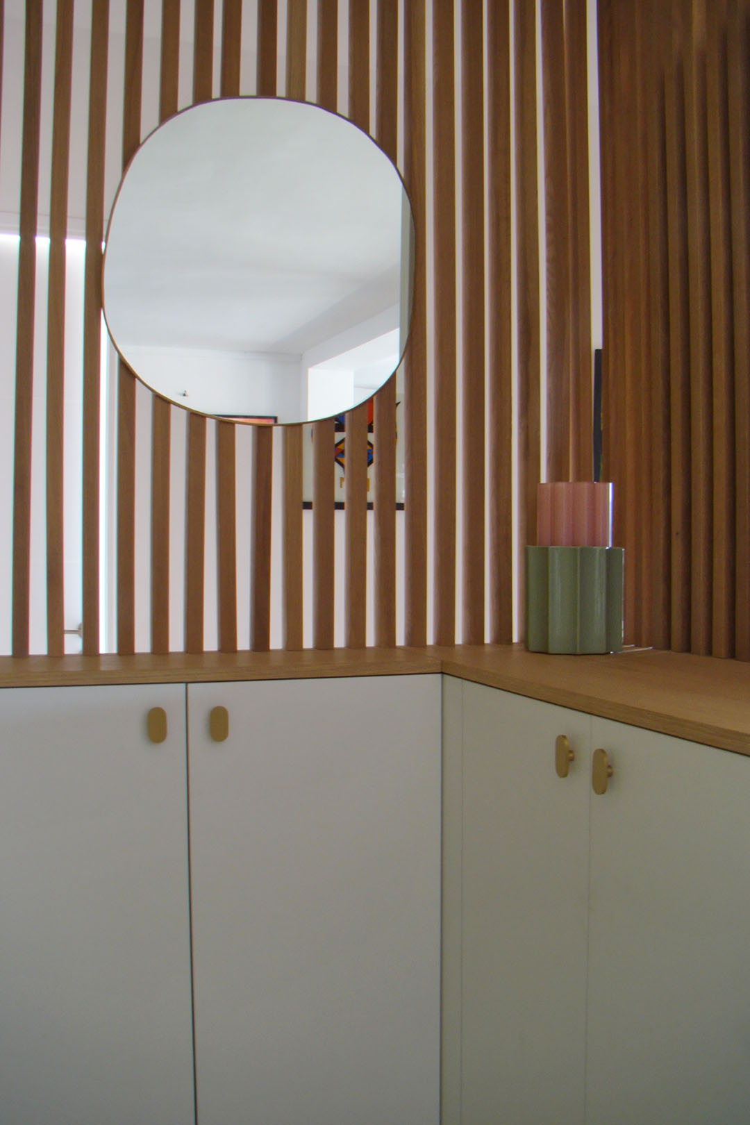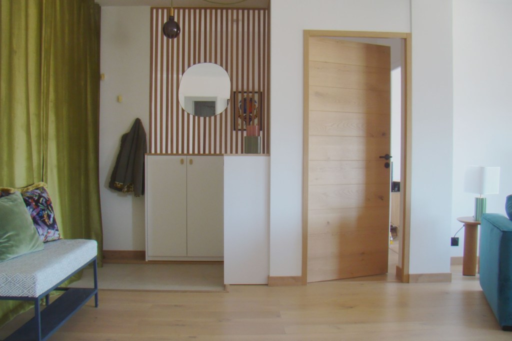 Il a donc été nécessaire de créer une véritable entrée et apporter une isolation phonique supplémentaire afin de couvrir les bruits provenant des parties communes. Nous avons donc créer une demie- cloison surmontée d’un claustra sur-mesure en chêne clair afin de laisser passer la lumière dans le couloir menant aux chambres, complété d’une porte afin de fermer l’accès à la partie nuit. Des rangements fermés également sur-mesure en partie basse permettent de ranger les chaussures et autres affaires personnelles.
