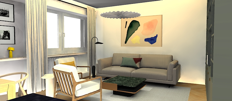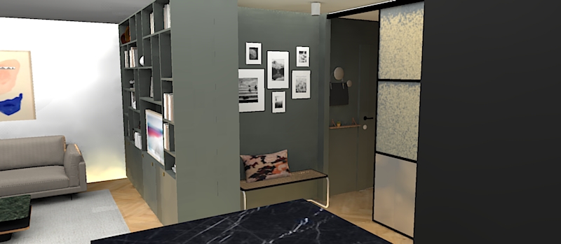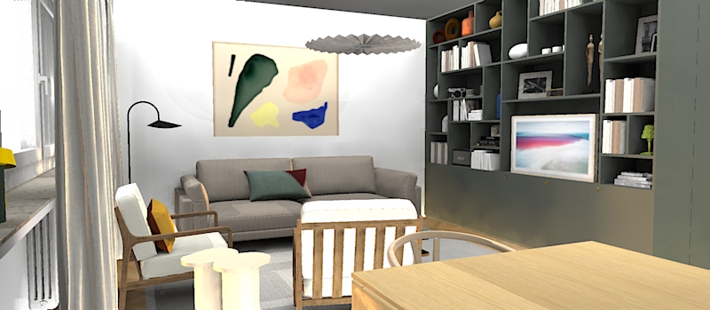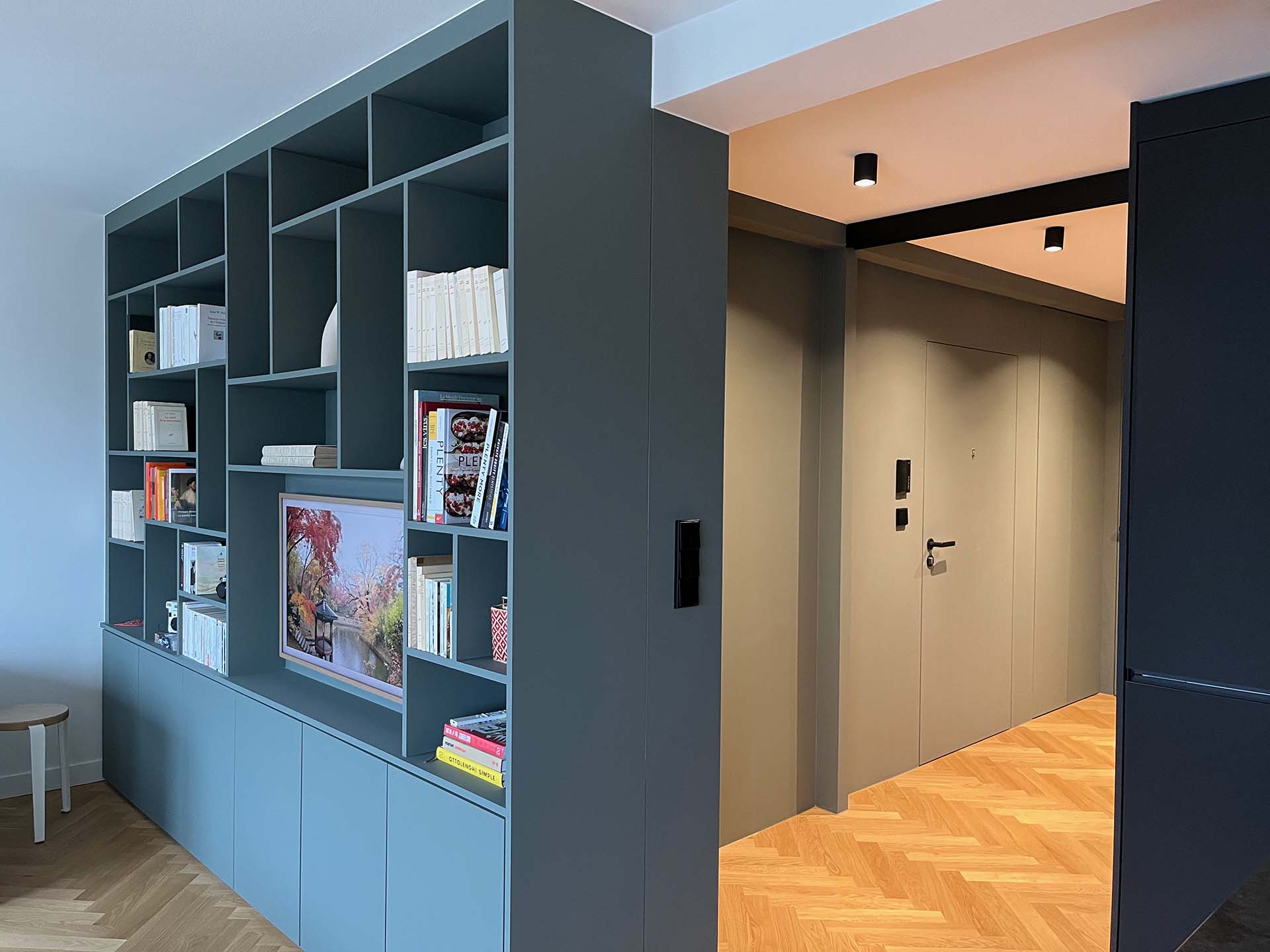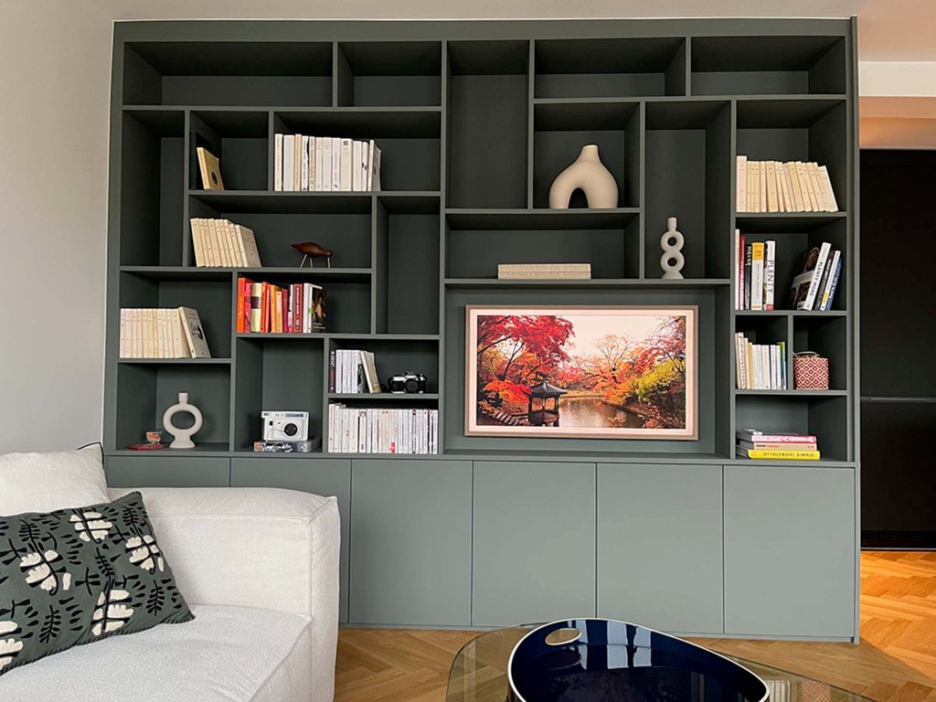Puis, dans un second temps, les clients ont réitéré leur demande d’accompagnement pour l’aménagement et la décoration du séjour, et plus particulièrement pour la création d’une bibliothèque sur mesure.