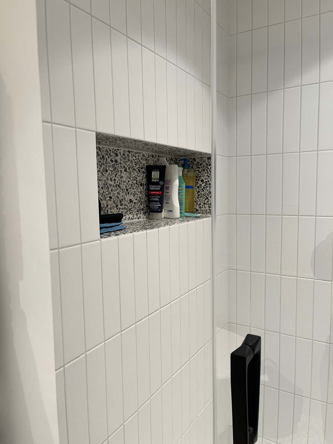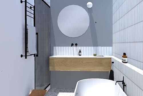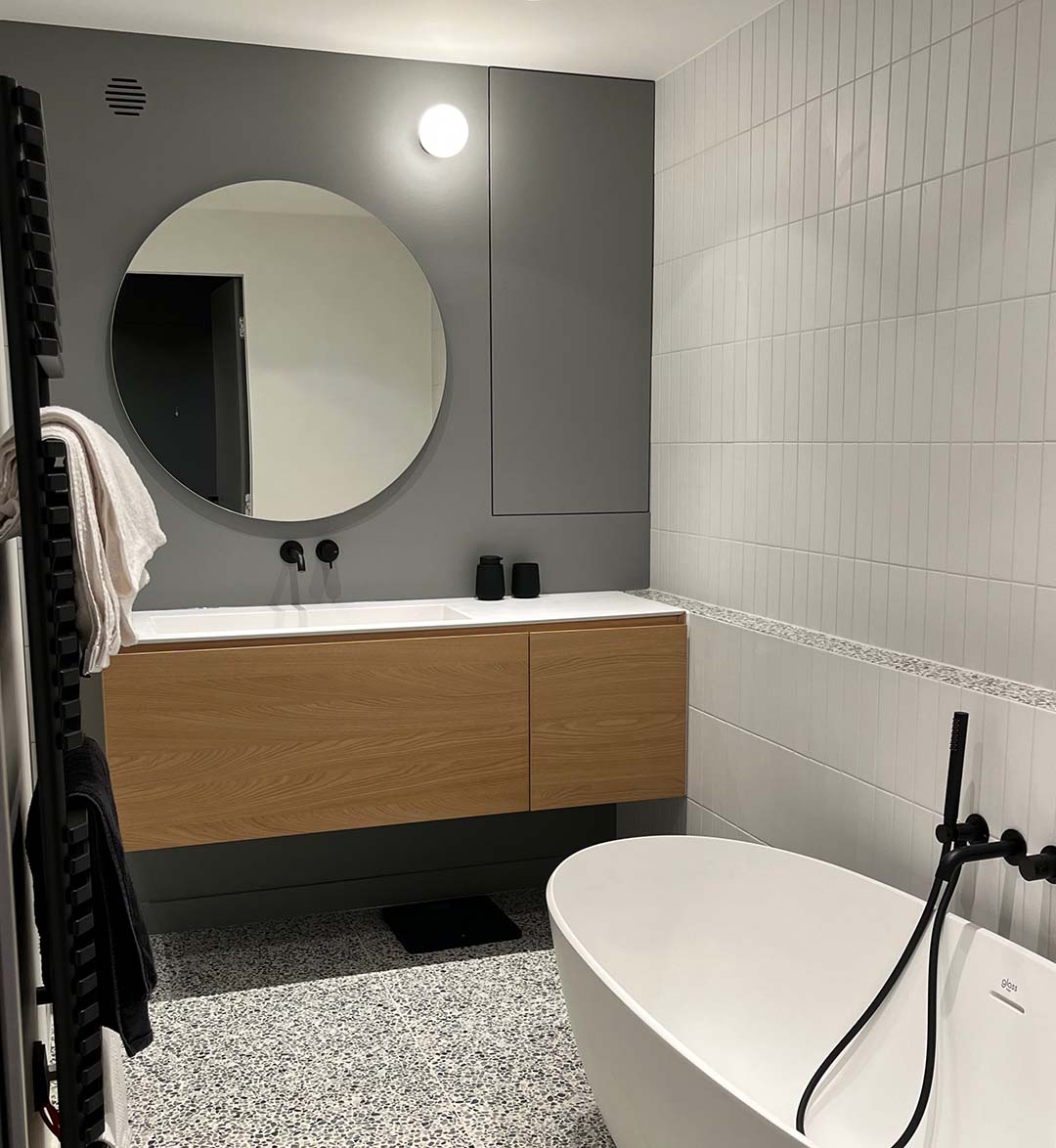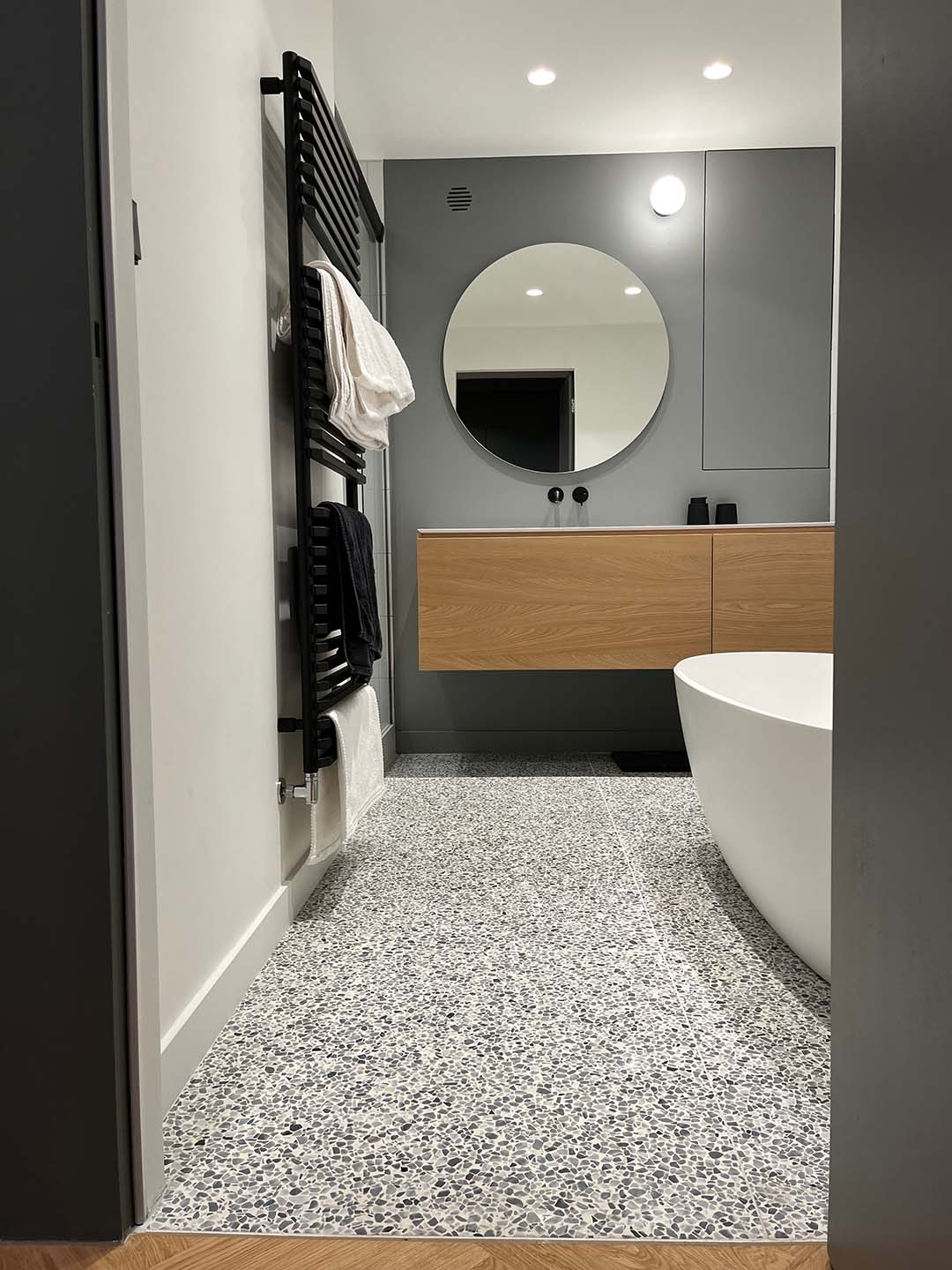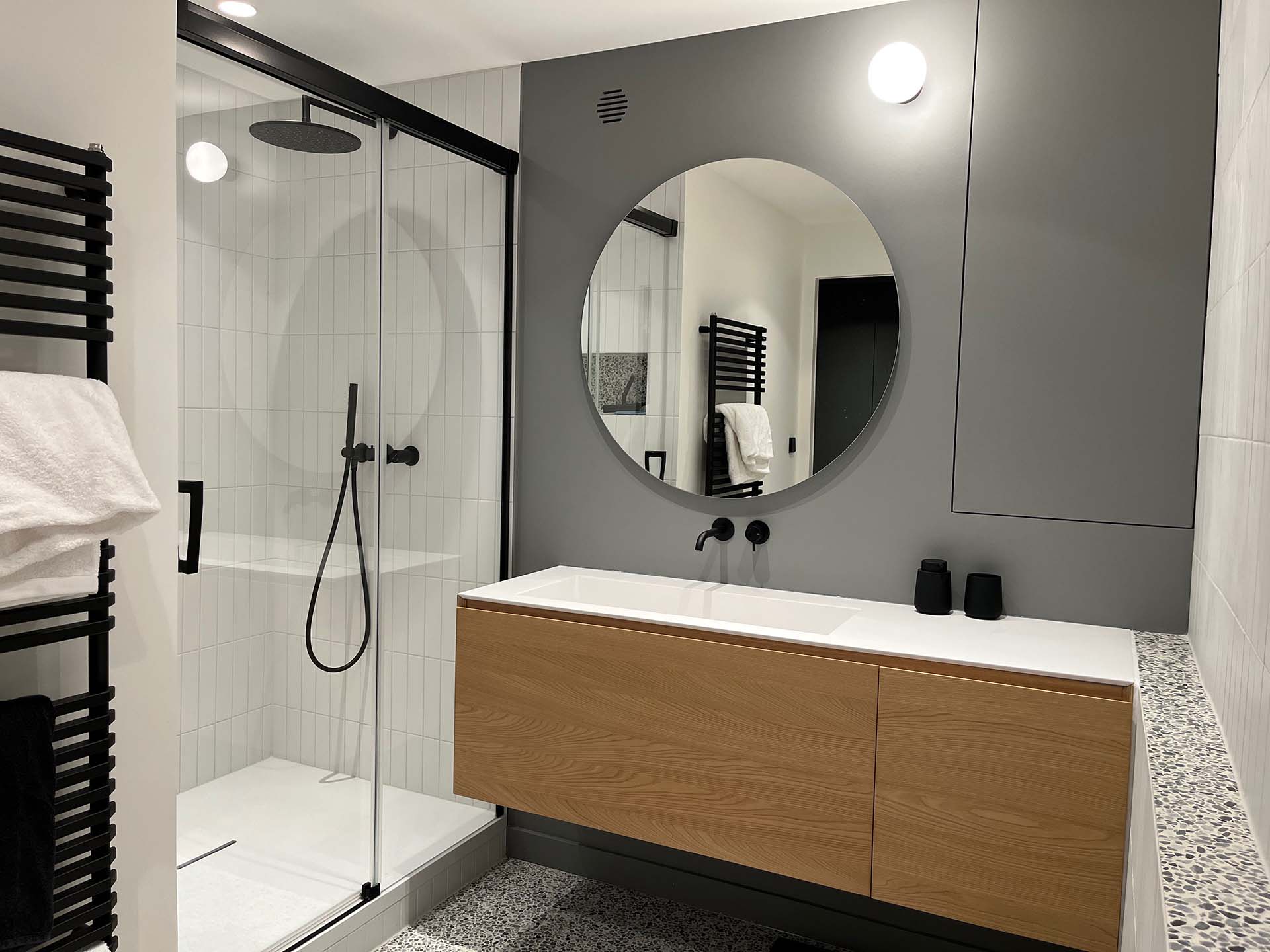 Ce projet s’est déroulé en deux temps. Après avoir acquis leur premier appartement, les clients souhaitaient être accompagnés pour l’aménagement et la décoration de l’entrée, la salle de bain et les toilettes qu’ils ont voulu dans un style moderne et intemporel, notamment dans le choix des matériaux comme le terrazzo gris combiné à du chêne pour le meuble vasque de la salle de bain.