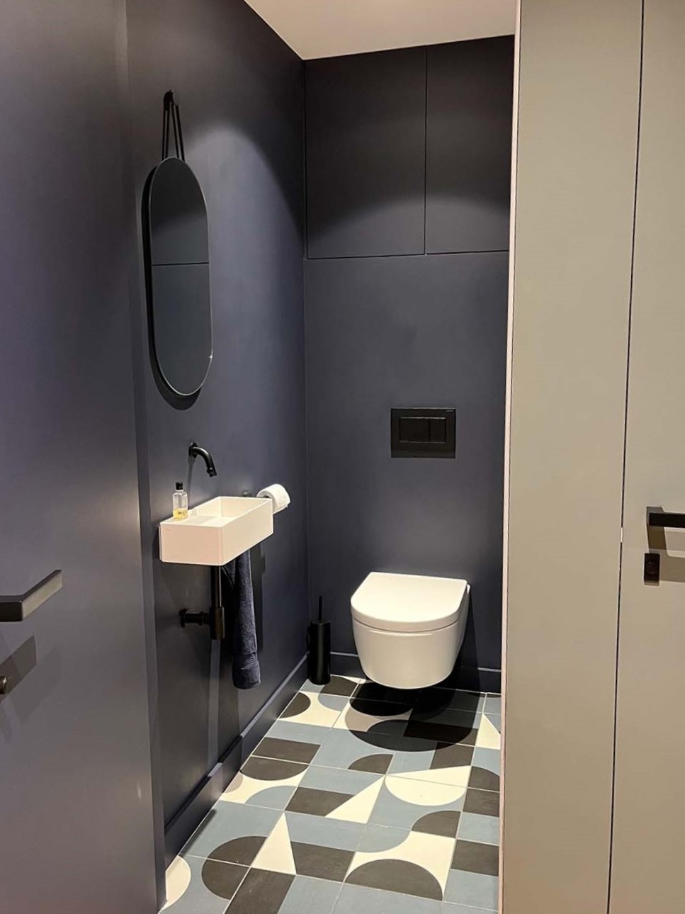 Quant aux toilettes, la demande a été également de créer une pièce à la décoration très graphique par le choix d’un sol aux motifs géométriques dans des teintes sombres alliées à une couleur plus douce tel que le rose nude.