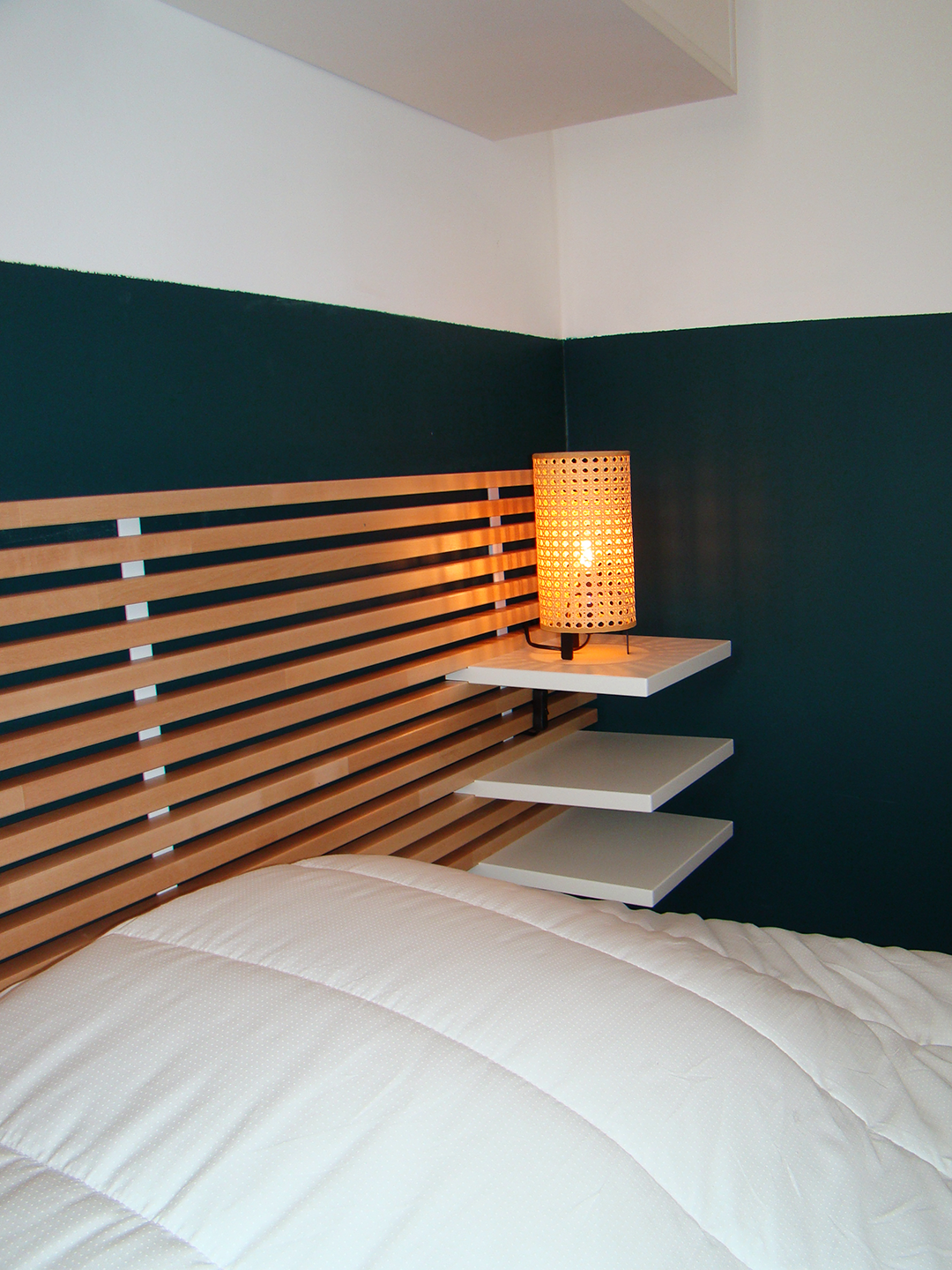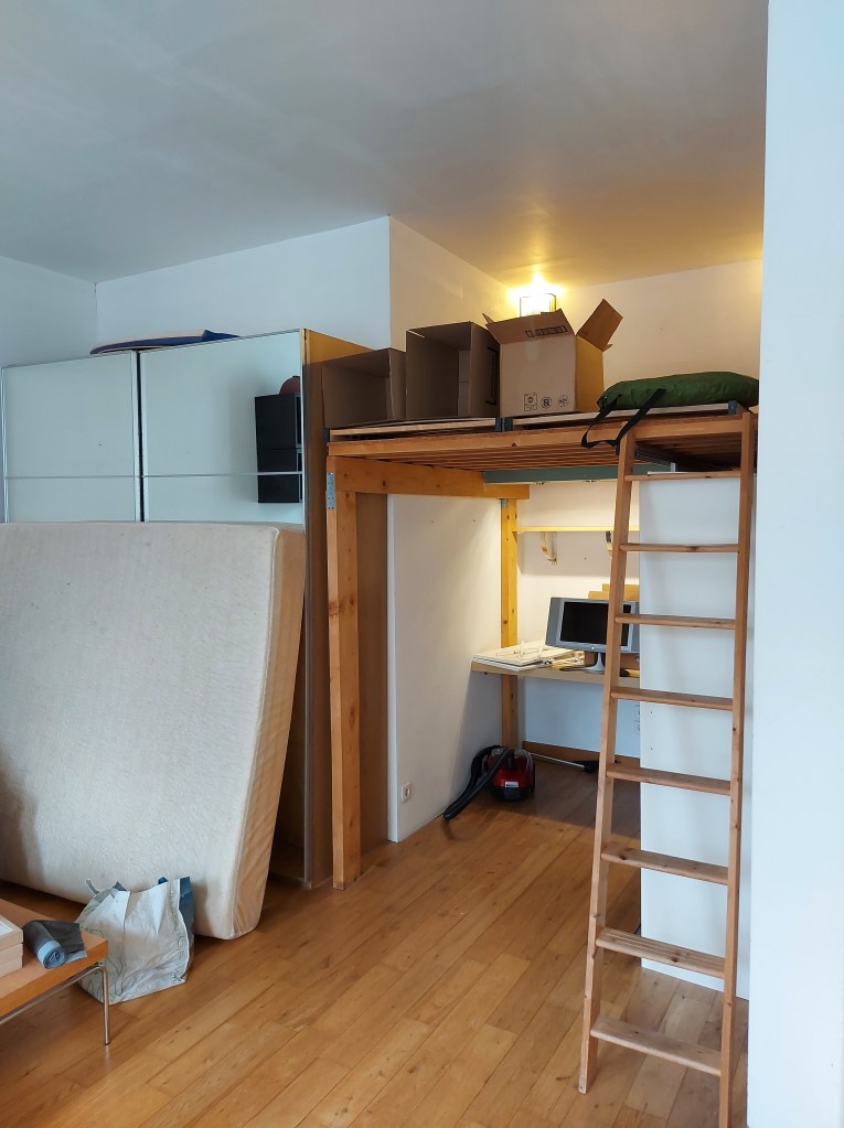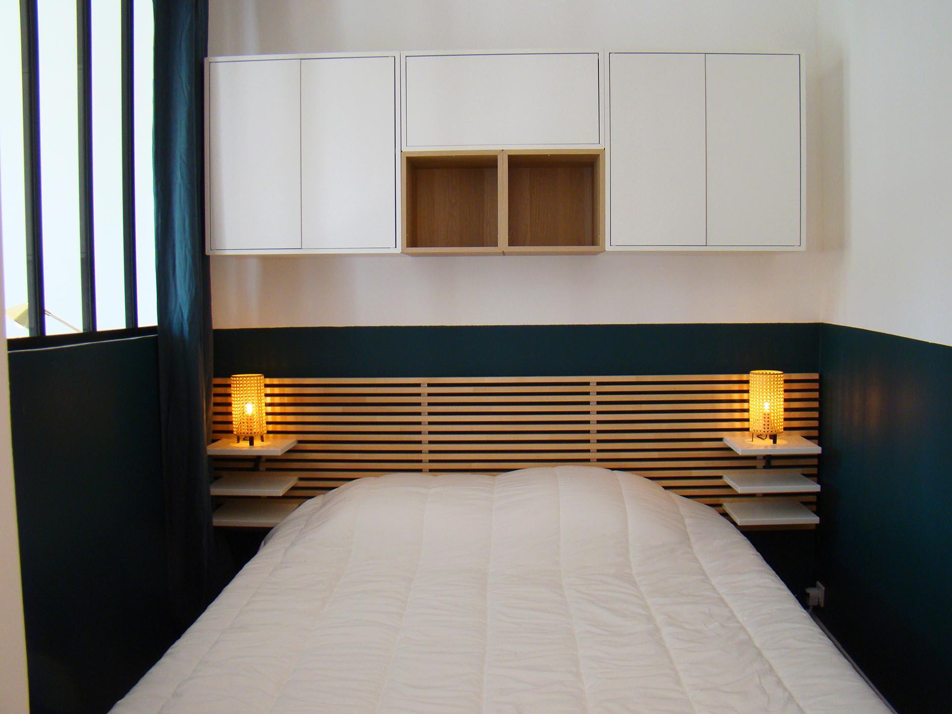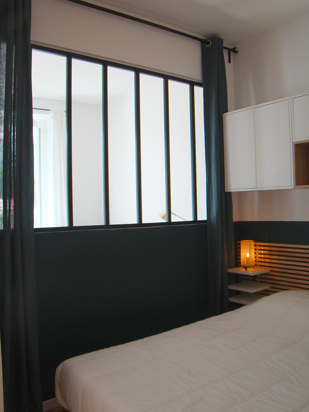 Nous y avons en premier lieu repensé l’aménagement, en créant un espace nuit bénéficiant d’un véritable lit isolé derrière une grande verrière afin de profiter de la lumière en second jour. Le renfoncement existant a été aménagé en espace de rangement avec un grand dressing que l’on peut dissimuler derrière de grands rideaux épais toute hauteur afin qu’il se fonde dans le décor.